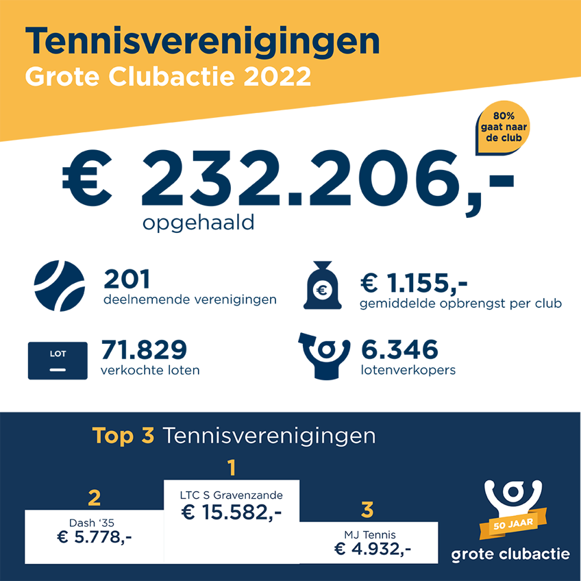 Meer dan 5.500 verenigingen verkochten tijdens de 50e editie samen ruim 4.2 miljoen loten. Met de opbrengst van bijna 13 miljoen euro verbreekt de Grote Clubactie al haar records. 201 tennisclubs deden mee tijdens de editie van 2022 en haalden samen een bedrag van € 232.206,- op. De hoogste opbrengst van een tennisvereniging was € 15.582,-.
